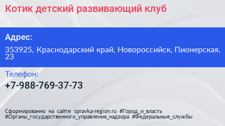Котик, детский развивающий клуб по адресу 353925, Краснодарский край, Новороссийск, Пионерская, 23 в дальнейшем Организация, размещена в следующих категориях: