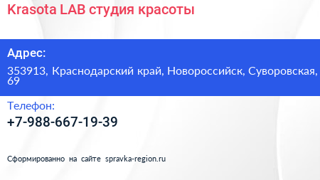 Krasota LAB, студия красоты по адресу 353913, Краснодарский край, Новороссийск, Суворовская, 69 в дальнейшем Организация, размещена в следующих категориях: