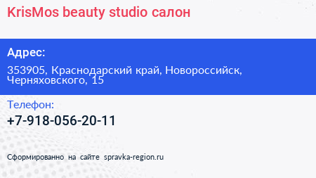 KrisMos beauty studio, салон по адресу 353905, Краснодарский край, Новороссийск, Черняховского, 15 в дальнейшем Организация, размещена в следующих категориях: