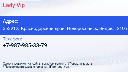 Lady Vip по адресу 353912, Краснодарский край, Новороссийск, Видова, 210а в дальнейшем Организация, размещена в следующих категориях: