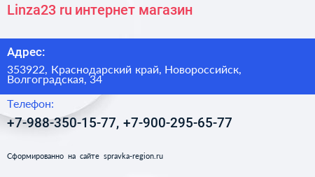 Linza23.ru, интернет-магазин по адресу 353922, Краснодарский край, Новороссийск, Волгоградская, 34 в дальнейшем Организация, размещена в следующих категориях: