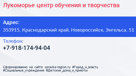 Лукоморье, центр обучения и творчества по адресу 353915, Краснодарский край, Новороссийск, Энгельса, 51 в дальнейшем Организация, размещена в следующих категориях:
