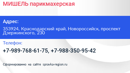 МИШЕЛЬ, парикмахерская по адресу 353924, Краснодарский край, Новороссийск, проспект Дзержинского, 230 в дальнейшем Организация, размещена в следующих категориях: