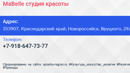 MaBelle, студия красоты по адресу 353907, Краснодарский край, Новороссийск, Вруцкого, 29а в дальнейшем Организация, размещена в следующих категориях: