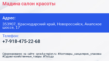 Мадина, салон красоты по адресу 353907, Краснодарский край, Новороссийск, Анапское шоссе, 17 в дальнейшем Организация, размещена в следующих категориях: