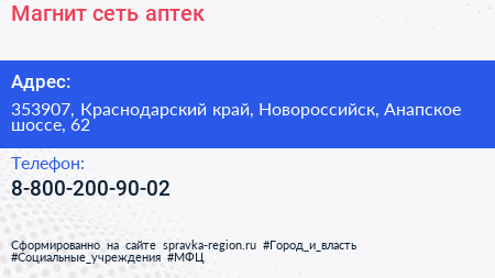 Магнит, сеть аптек по адресу 353907, Краснодарский край, Новороссийск, Анапское шоссе, 62 в дальнейшем Организация, размещена в следующих категориях: