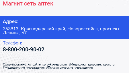Магнит, сеть аптек по адресу 353913, Краснодарский край, Новороссийск, проспект Ленина, 67 в дальнейшем Организация, размещена в следующих категориях: