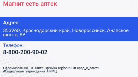 Магнит, сеть аптек по адресу 353960, Краснодарский край, Новороссийск, Анапское шоссе, 89 в дальнейшем Организация, размещена в следующих категориях: