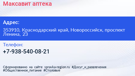 Максавит, аптека по адресу 353910, Краснодарский край, Новороссийск, проспект Ленина, 23 в дальнейшем Организация, размещена в следующих категориях: