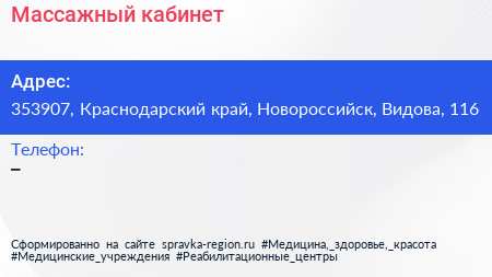 Массажный кабинет по адресу 353907, Краснодарский край, Новороссийск, Видова, 116 в дальнейшем Организация, размещена в следующих категориях: