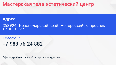 Мастерская тела, эстетический центр по адресу 353924, Краснодарский край, Новороссийск, проспект Ленина, 99 в дальнейшем Организация, размещена в следующих категориях: