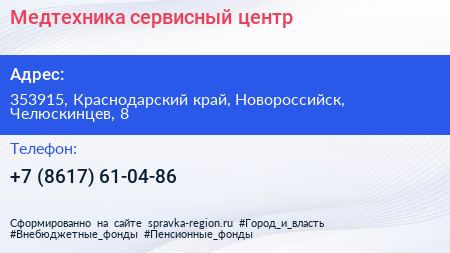 Медтехника, сервисный центр по адресу 353915, Краснодарский край, Новороссийск, Челюскинцев, 8 в дальнейшем Организация, размещена в следующих категориях: