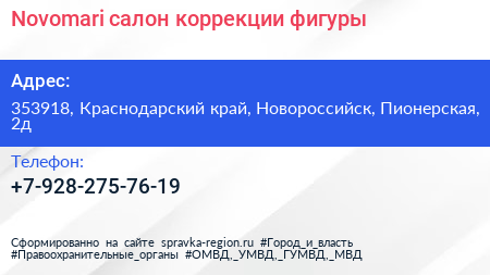 Novomari, салон коррекции фигуры по адресу 353918, Краснодарский край, Новороссийск, Пионерская, 2д в дальнейшем Организация, размещена в следующих категориях: