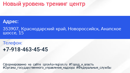 Новый уровень, тренинг-центр по адресу 353907, Краснодарский край, Новороссийск, Анапское шоссе, 15 в дальнейшем Организация, размещена в следующих категориях: