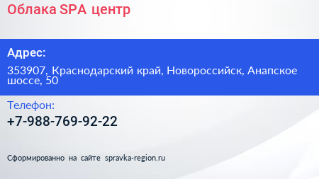Облака, SPA-центр по адресу 353907, Краснодарский край, Новороссийск, Анапское шоссе, 50 в дальнейшем Организация, размещена в следующих категориях: