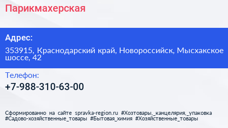 Парикмахерская по адресу 353915, Краснодарский край, Новороссийск, Мысхакское шоссе, 42 в дальнейшем Организация, размещена в следующих категориях: