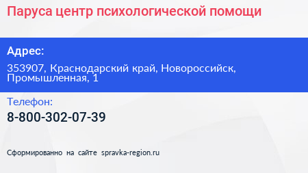 Паруса, центр психологической помощи по адресу 353907, Краснодарский край, Новороссийск, Промышленная, 1 в дальнейшем Организация, размещена в следующих категориях: