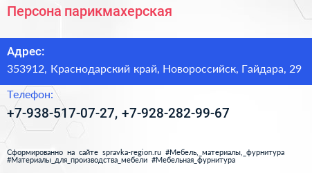 Персона, парикмахерская по адресу 353912, Краснодарский край, Новороссийск, Гайдара, 29 в дальнейшем Организация, размещена в следующих категориях: