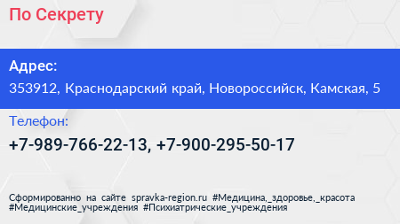 По Секрету по адресу 353912, Краснодарский край, Новороссийск, Камская, 5 в дальнейшем Организация, размещена в следующих категориях: