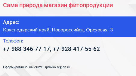 Сама природа, магазин фитопродукции по адресу Краснодарский край, Новороссийск, Ореховая, 3 в дальнейшем Организация, размещена в следующих категориях: