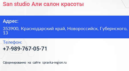 San studio Али, салон красоты по адресу 353900, Краснодарский край, Новороссийск, Губернского, 13 в дальнейшем Организация, размещена в следующих категориях: