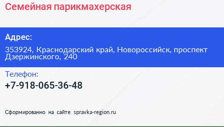 Семейная, парикмахерская по адресу 353924, Краснодарский край, Новороссийск, проспект Дзержинского, 240 в дальнейшем Организация, размещена в следующих категориях: