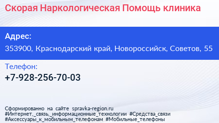 Скорая Наркологическая Помощь, клиника по адресу 353900, Краснодарский край, Новороссийск, Советов, 55 в дальнейшем Организация, размещена в следующих категориях: