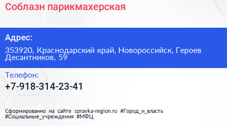 Соблазн, парикмахерская по адресу 353920, Краснодарский край, Новороссийск, Героев Десантников, 59 в дальнейшем Организация, размещена в следующих категориях: