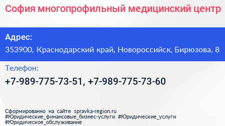 София, многопрофильный медицинский центр по адресу 353900, Краснодарский край, Новороссийск, Бирюзова, 8 в дальнейшем Организация, размещена в следующих категориях: