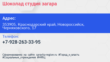 Шоколад, студия загара по адресу 353905, Краснодарский край, Новороссийск, Черняховского, 17 в дальнейшем Организация, размещена в следующих категориях: