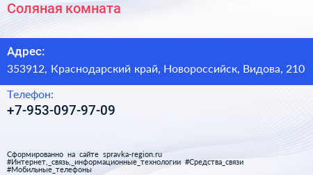 Соляная комната по адресу 353912, Краснодарский край, Новороссийск, Видова, 210 в дальнейшем Организация, размещена в следующих категориях: