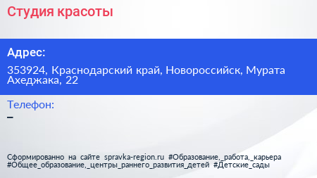 Студия красоты по адресу 353924, Краснодарский край, Новороссийск, Мурата Ахеджака, 22 в дальнейшем Организация, размещена в следующих категориях: