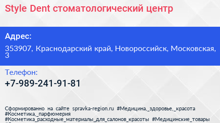 Style Dent, стоматологический центр по адресу 353907, Краснодарский край, Новороссийск, Московская, 3 в дальнейшем Организация, размещена в следующих категориях: