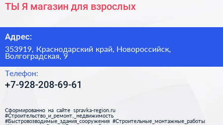 ТЫ & Я, магазин для взрослых по адресу 353919, Краснодарский край, Новороссийск, Волгоградская, 9 в дальнейшем Организация, размещена в следующих категориях: