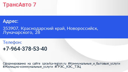ТрансАвто-7 по адресу 353907, Краснодарский край, Новороссийск, Луначарского, 28 в дальнейшем Организация, размещена в следующих категориях: