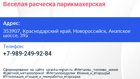 Веселая расческа, парикмахерская по адресу 353907, Краснодарский край, Новороссийск, Анапское шоссе, 39а в дальнейшем Организация, размещена в следующих категориях: