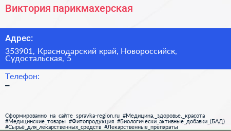 Виктория, парикмахерская по адресу 353901, Краснодарский край, Новороссийск, Судостальская, 5 в дальнейшем Организация, размещена в следующих категориях: