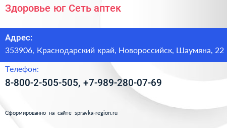 Здоровье-юг, Сеть аптек по адресу 353906, Краснодарский край, Новороссийск, Шаумяна, 22 в дальнейшем Организация, размещена в следующих категориях:
