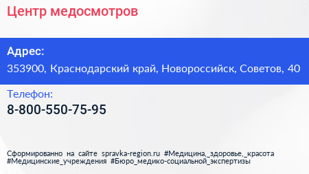 Центр медосмотров по адресу 353900, Краснодарский край, Новороссийск, Советов, 40 в дальнейшем Организация, размещена в следующих категориях: