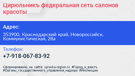 Цирюльникъ, федеральная сеть салонов красоты по адресу 353900, Краснодарский край, Новороссийск, Коммунистическая, 28а в дальнейшем Организация, размещена в следующих категориях: