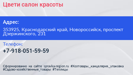 Цвети, салон красоты по адресу 353925, Краснодарский край, Новороссийск, проспект Дзержинского, 231 в дальнейшем Организация, размещена в следующих категориях: