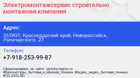 Электромонтажсервис, строительно-монтажная компания по адресу 353907, Краснодарский край, Новороссийск, Луначарского, 27 в дальнейшем Организация, размещена в следующих категориях: