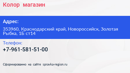 Колор+, магазин по адресу 353960, Краснодарский край, Новороссийск, Золотая Рыбка, 1Б ст14 в дальнейшем Организация, размещена в следующих категориях: