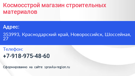 Космосстрой, магазин строительных материалов по адресу 353993, Краснодарский край, Новороссийск, Шоссейная, 27 в дальнейшем Организация, размещена в следующих категориях: