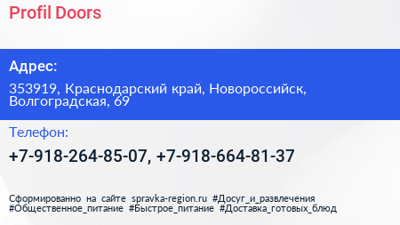 Profil Doors по адресу 353919, Краснодарский край, Новороссийск, Волгоградская, 69 в дальнейшем Организация, размещена в следующих категориях: