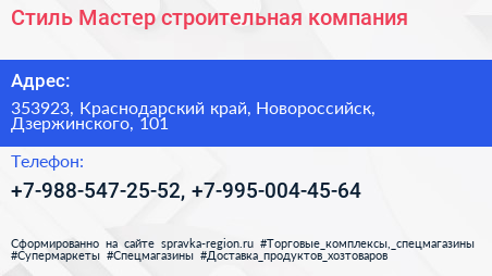 Стиль Мастер, строительная компания по адресу 353923, Краснодарский край, Новороссийск, Дзержинского, 101 в дальнейшем Организация, размещена в следующих категориях: