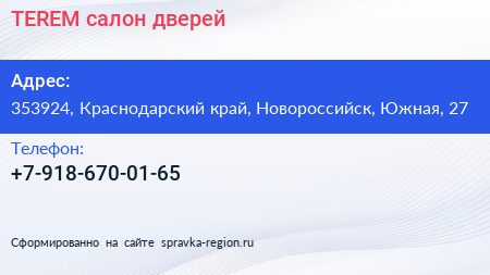 TEREM, салон дверей по адресу 353924, Краснодарский край, Новороссийск, Южная, 27 в дальнейшем Организация, размещена в следующих категориях: