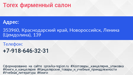 Torex, фирменный салон по адресу 353960, Краснодарский край, Новороссийск, Ленина (Цемдолина), 139 в дальнейшем Организация, размещена в следующих категориях:
