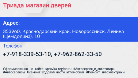 Триада, магазин дверей по адресу 353960, Краснодарский край, Новороссийск, Ленина (Цемдолина), 10 в дальнейшем Организация, размещена в следующих категориях: