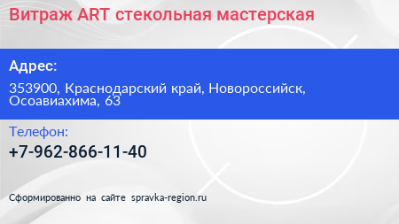 Витраж-ART, стекольная мастерская по адресу 353900, Краснодарский край, Новороссийск, Осоавиахима, 63 в дальнейшем Организация, размещена в следующих категориях: